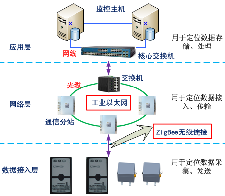 實現原理:系統是在綜合通信平臺上實現的人員定位功能的應用,只需要在已經構建好的綜合平臺上增加相應標識卡終端和定位應用服務器即可。