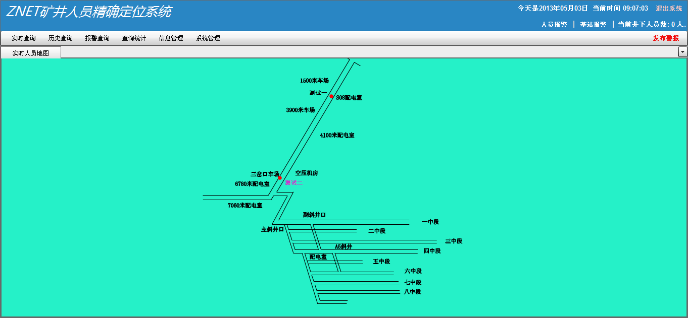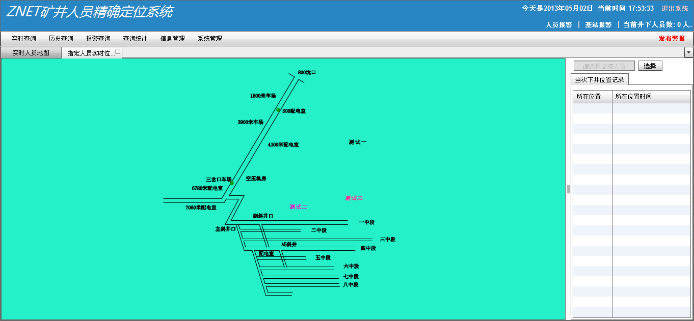 4)指定人員實時跟蹤:實時的查詢井下指定人員的當前位置;可按照標識卡號,姓名模糊查詢或者按照部門,職務查詢井下人員的實時位置。人員會具體的顯示在基站的左邊(或者右邊)多少米處,當方向或者距基站的位置變化時,會進行實時的移動。