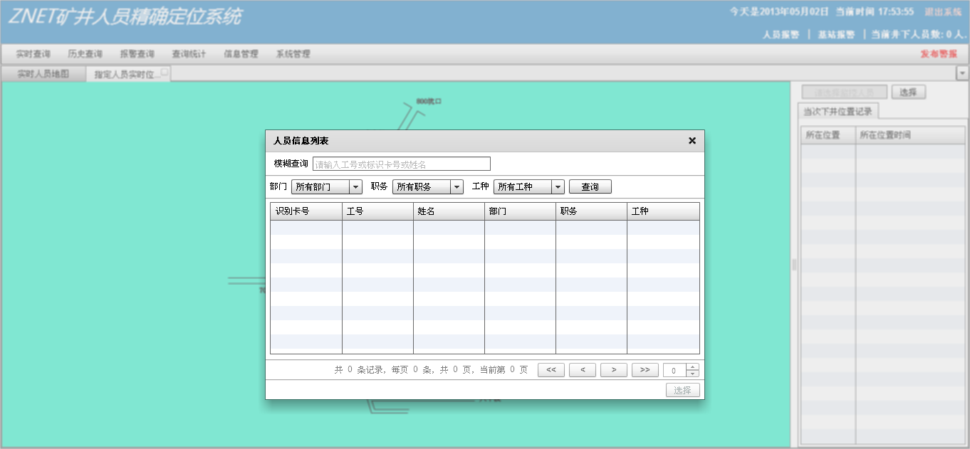7、干部管理功能:系統能對干部下井情況進行統計、監督,領導在辦公室通過電腦或在調度室大屏幕就可以看到哪些干部在井下,哪些干部已升井,哪些干部該下井未下井等。