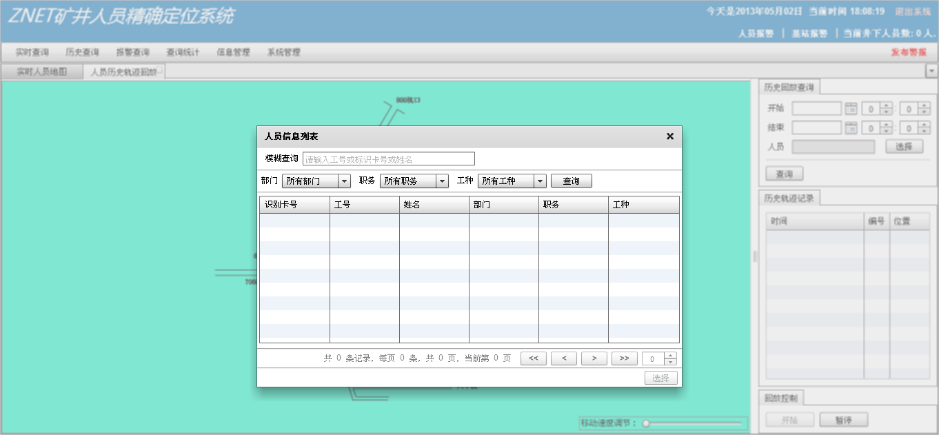 2、歷史查詢:選擇時間點可提供歷史時間點人員位置查詢功能,選擇開始和結束時間可提供歷史時間段人員位置、歷史行走軌跡回放、人員出入井記錄、特種人員路線結果查詢、人員出入限制區域查詢、特種人員出入重點區域查詢、特種人員出入限制區域查詢,區域超員人員列表查詢、全礦超員等查詢功能以及按分站查詢進出分站數據: