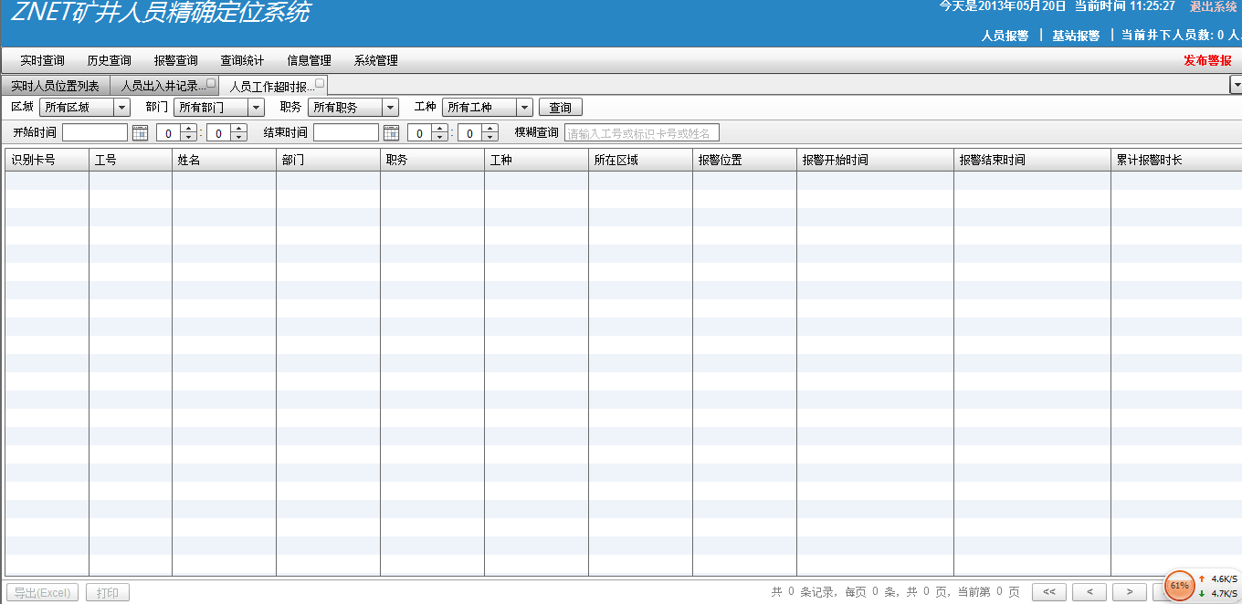 3、報警查詢:提供標識卡按鍵及低電量、人員進入重點區域及人員超時、區域超員、缺員等報警查詢功能。