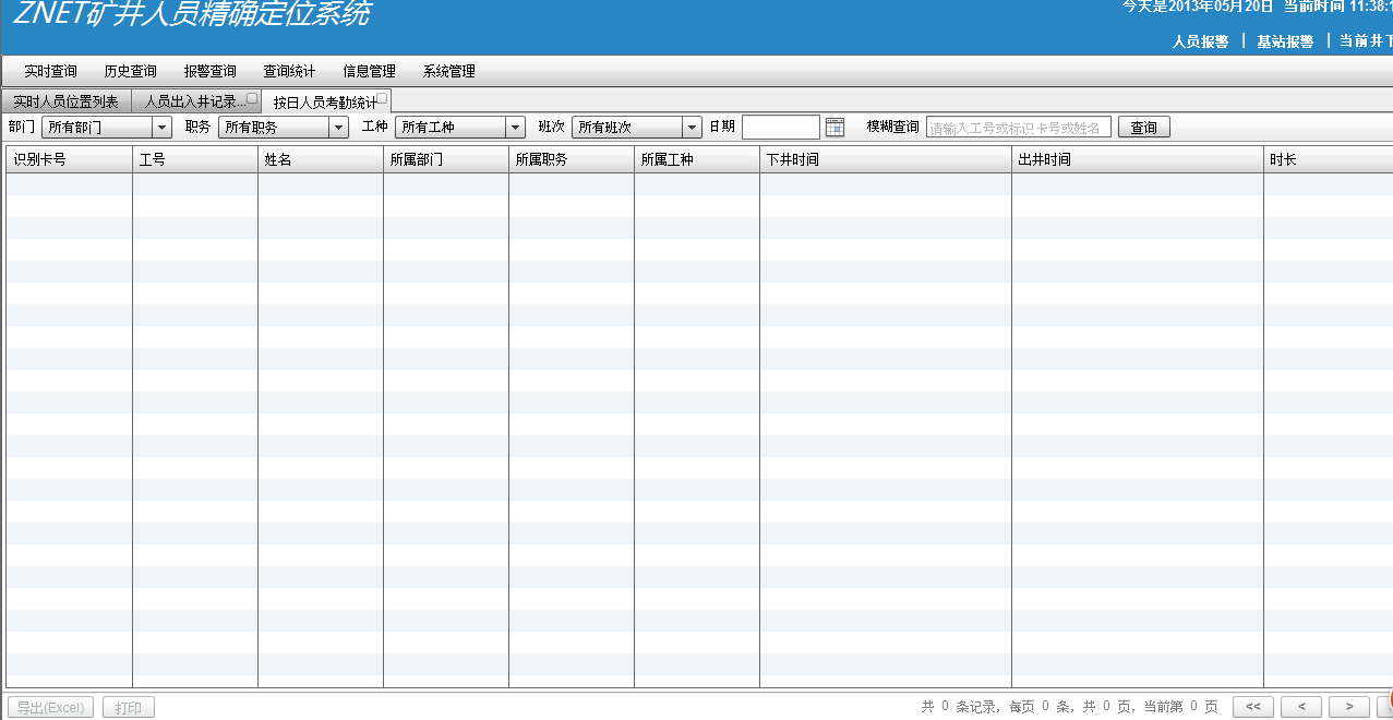1)日考勤統計:選擇要查詢的日期(某一天),輸入工號或者標識卡號或者姓名來查詢人員的出入井信息,也可按部門、職務、工種來查詢,并且可以生成日統計表。