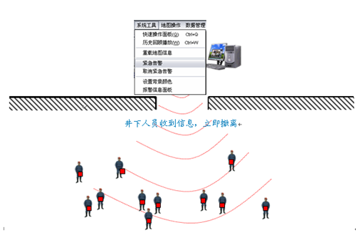 調度中心也可通過定位軟件向井下攜卡人員發出報警信息,可對井下全部或區域區內攜卡人員發出報警信息,標識卡將以聲音、振動及紅燈閃爍等方式提醒攜卡人員。
