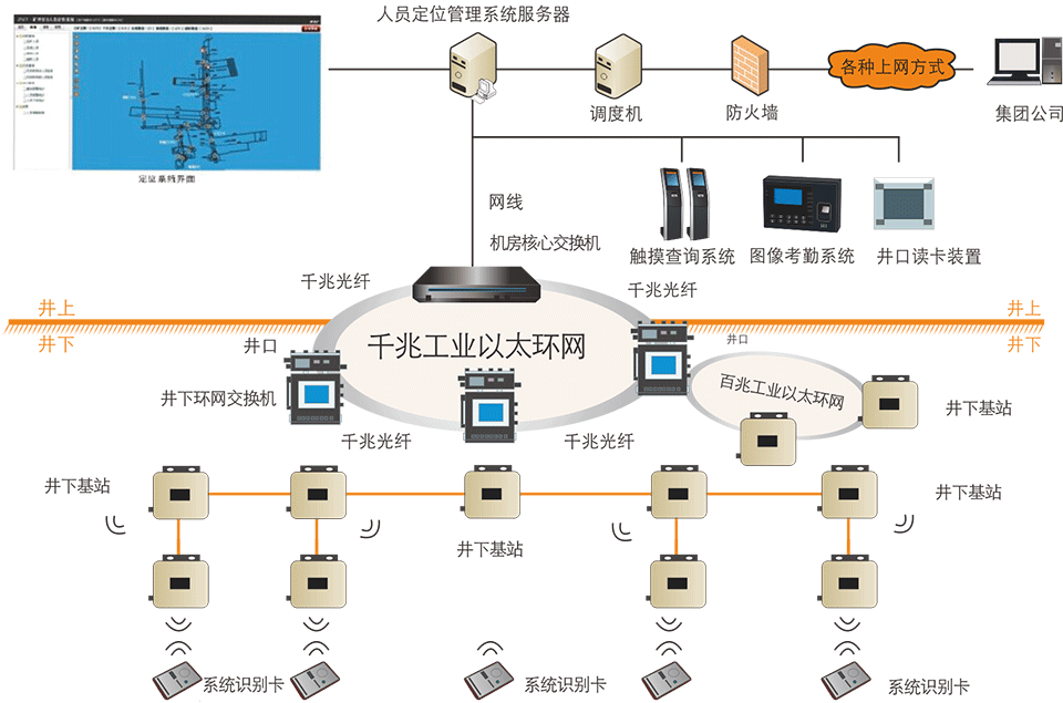 硬件部署:地面調度室部署定位服務器,人員佩戴標識卡,井下安裝綜合分站、電源、等設備。